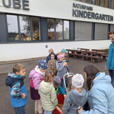 Ein besonderes Highlight im Oktober war das Apfelsaftpressen mit Rainer Silber vom Naturpark. Rainer zeigte unseren Kindern wie aus Äpfeln frischer Saft gepresst wird. Die Kinder durften bei jedem Arbeitsschritt mithelfen und waren mit großem Eifer und Fleiß bei der Sache. Im Anschluss wurde der selbstgepresste Saft verkostet.
